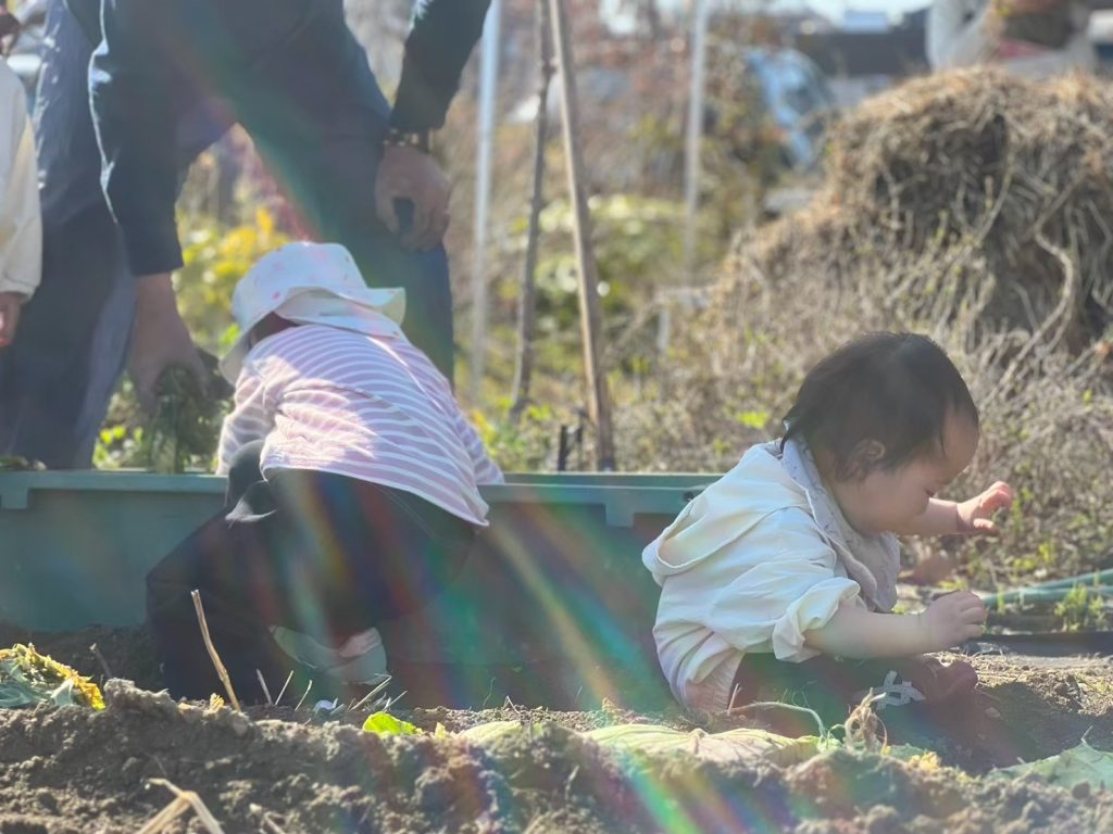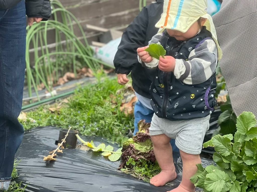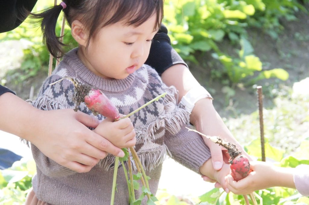 ・畑の中で遊ぶことで視覚・聴覚・触覚・味覚・嗅覚という五感が刺激され、子どもたちの豊かな情緒や発想力などが養われ 感受性・感性を育てます。