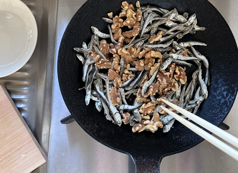 1、フライパンにごまめとくるみを重ならないように並べ、弱火で3分ほど、焦がさないようにゆっくり乾煎りする。香ばしい香りが立ったら取り出す。