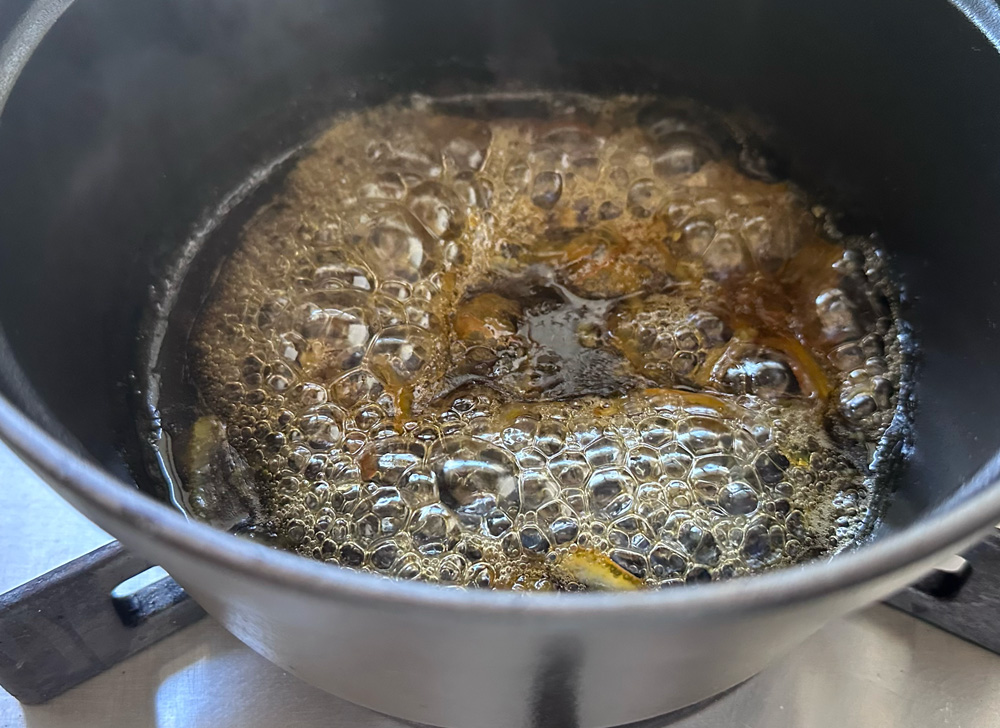 2、小鍋にマーマレードとしょうゆを入れて中火にかけ、ぽこぽこと泡が立ち、焦がさないように気をつけ水分が飛んでとろみが出るまで煮つめる。